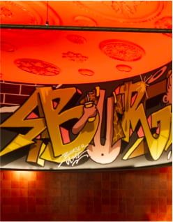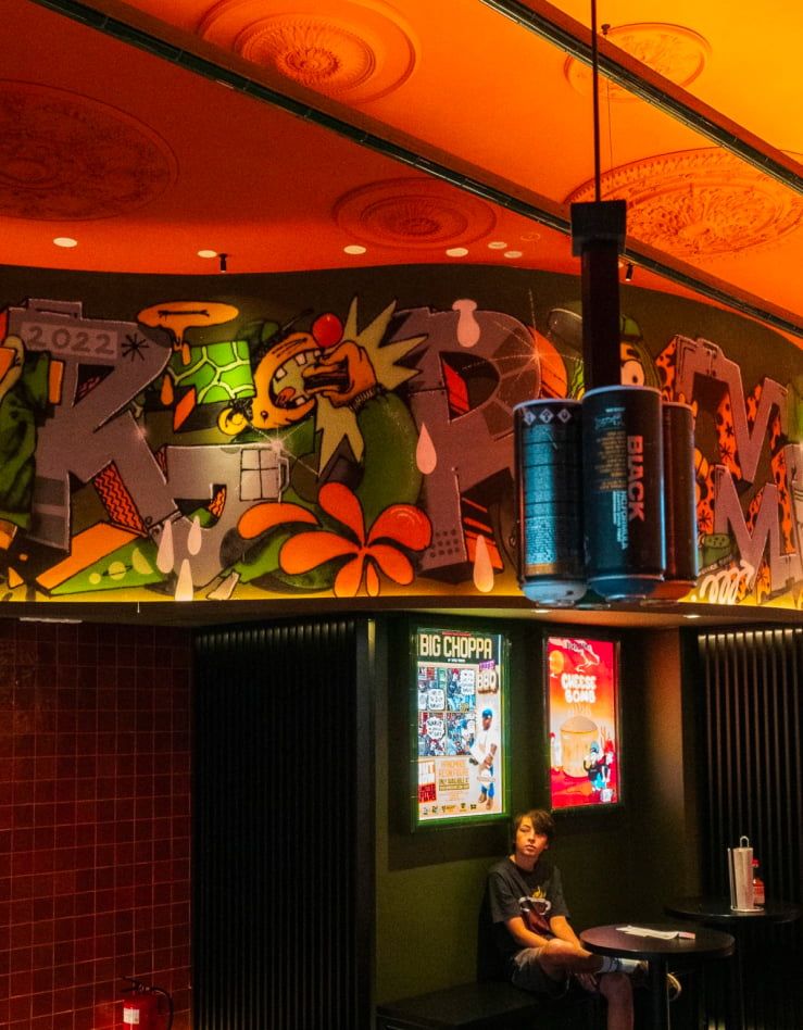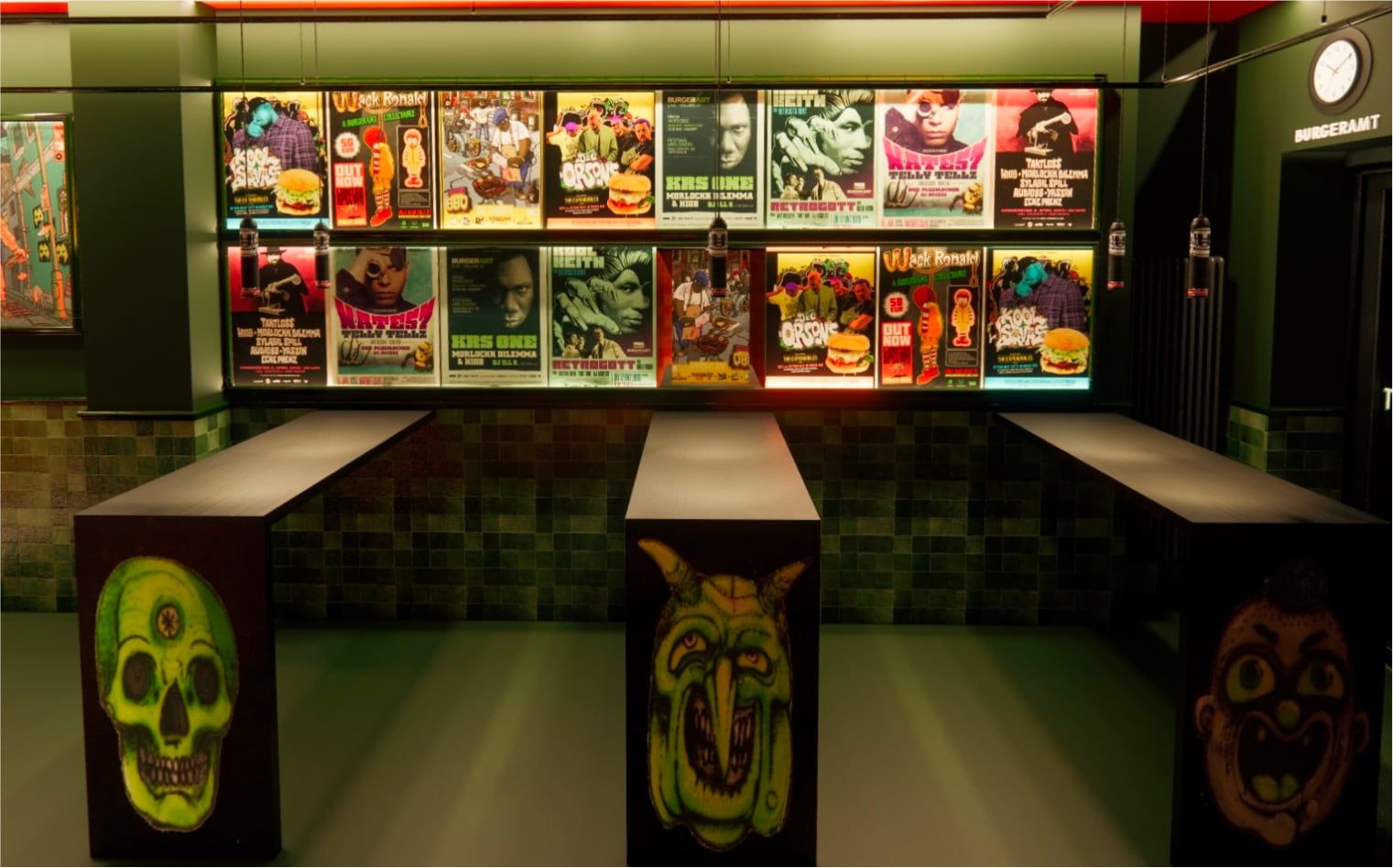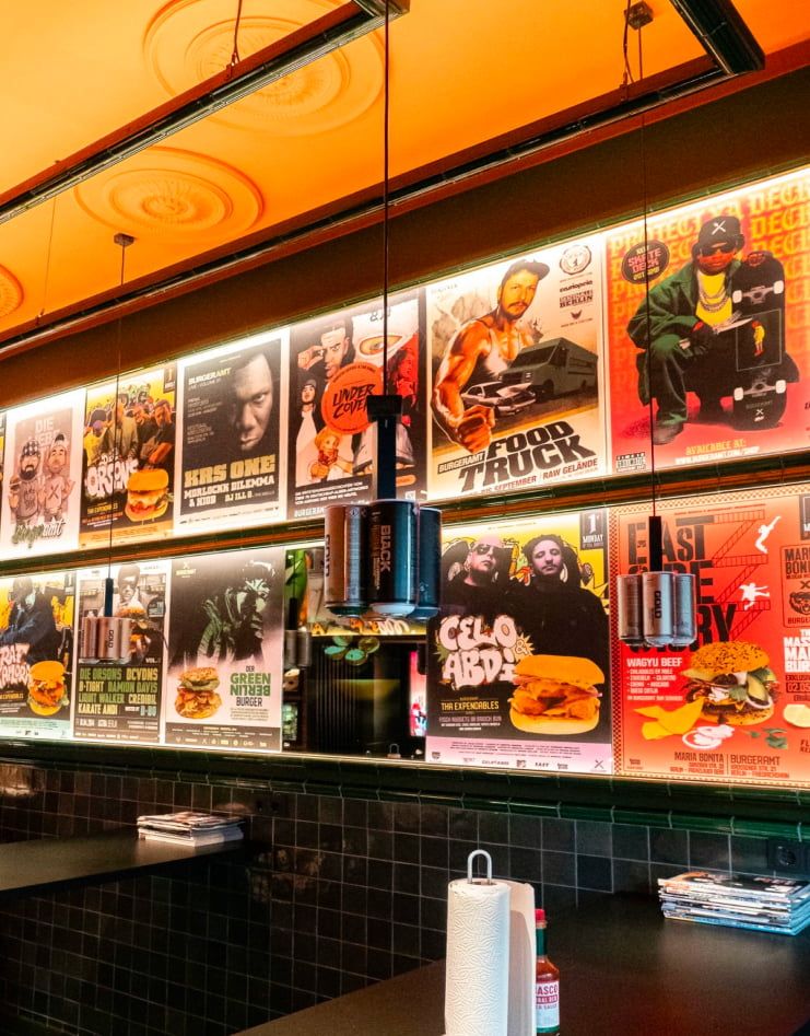 Das Bürgeramt in der Danzigerstraße in Berlin wurde mit einem besonderen Graffiti- und Grafikdesign zu einem einzigartigen Burger-Spot. Die Beleuchtungsgestaltung wurde gezielt entwickelt, um ein beeindruckendes Deckenkunstwerk zu gestalten. Das grün-orange Farbschema zieht sich durch das gesamte Restaurant und schafft einen auffälligen Kontrast.