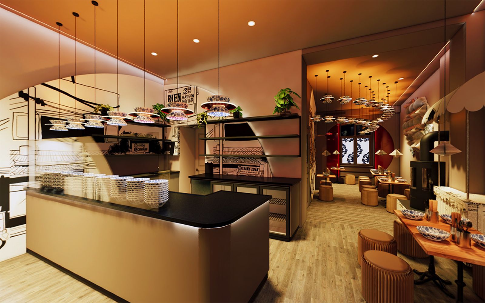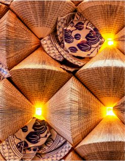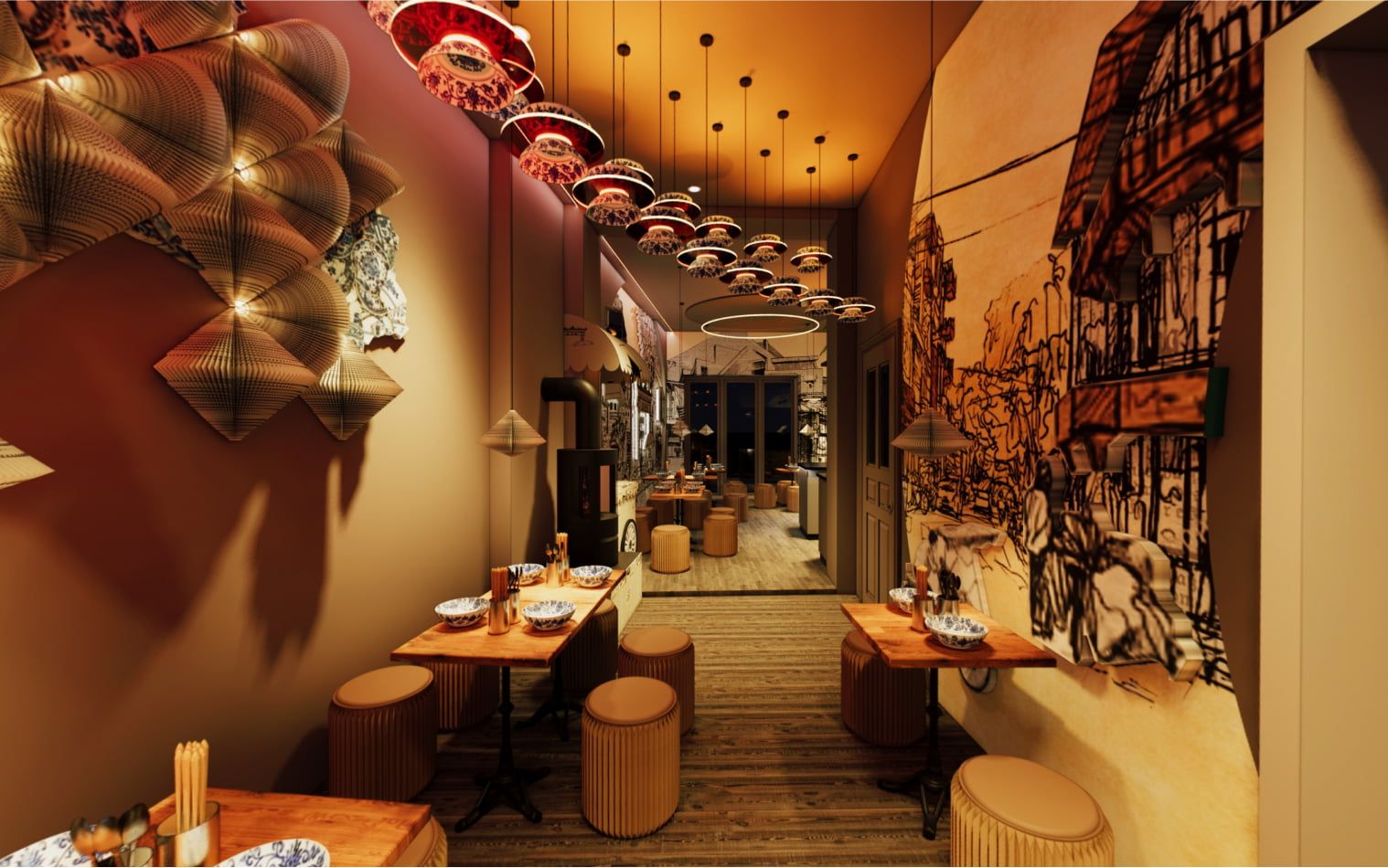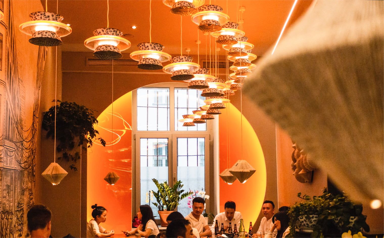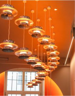 Die keramischen Lichtinstallationen senken sich von der Decke herab, werfen warmes Licht nach unten und ergänzen den sonnigen Wandscheinwerfer, wodurch das gesamte Beleuchtungskonzept zu einem harmonischen Erlebnis wird.