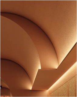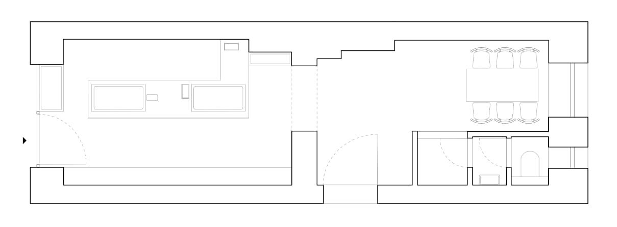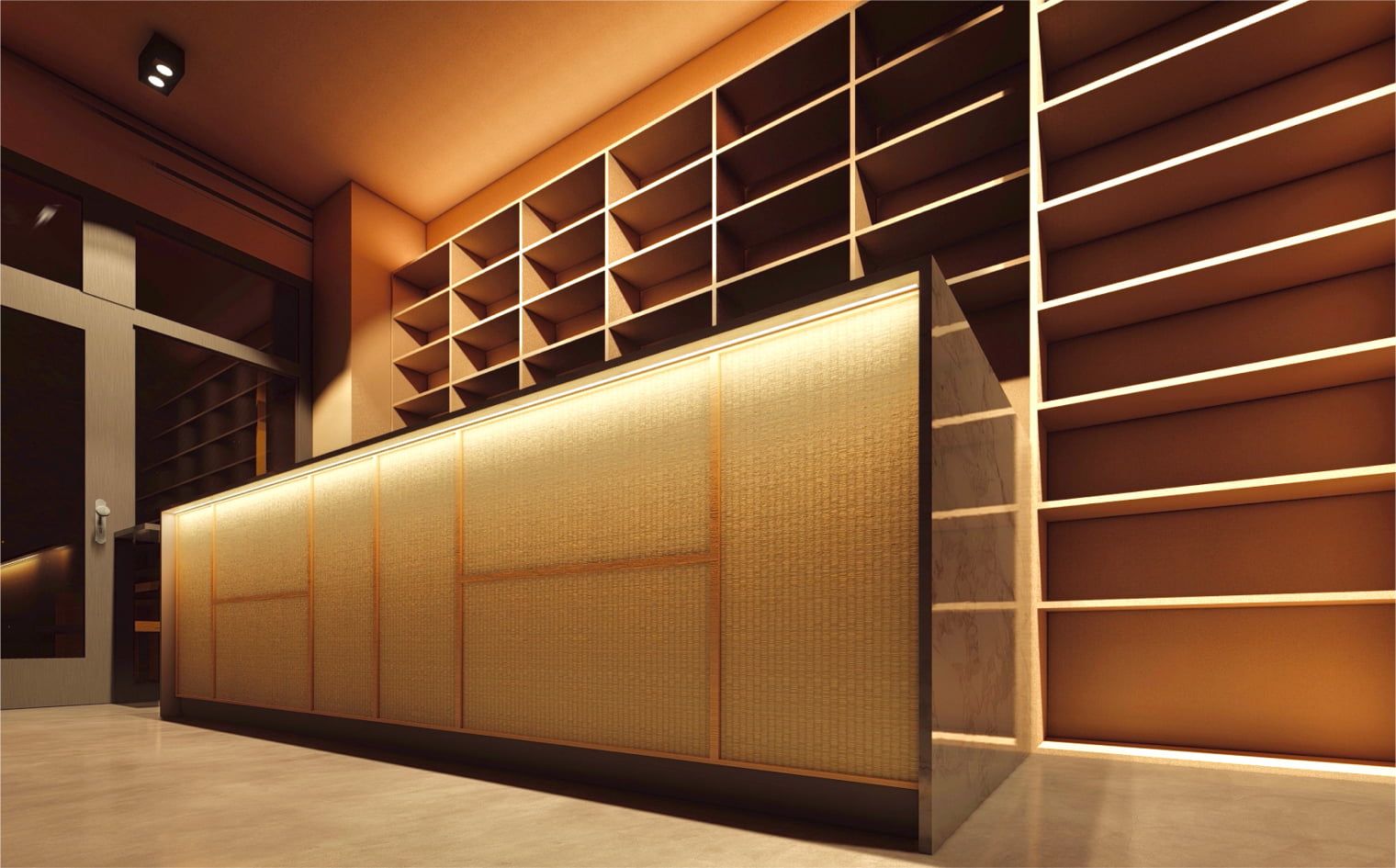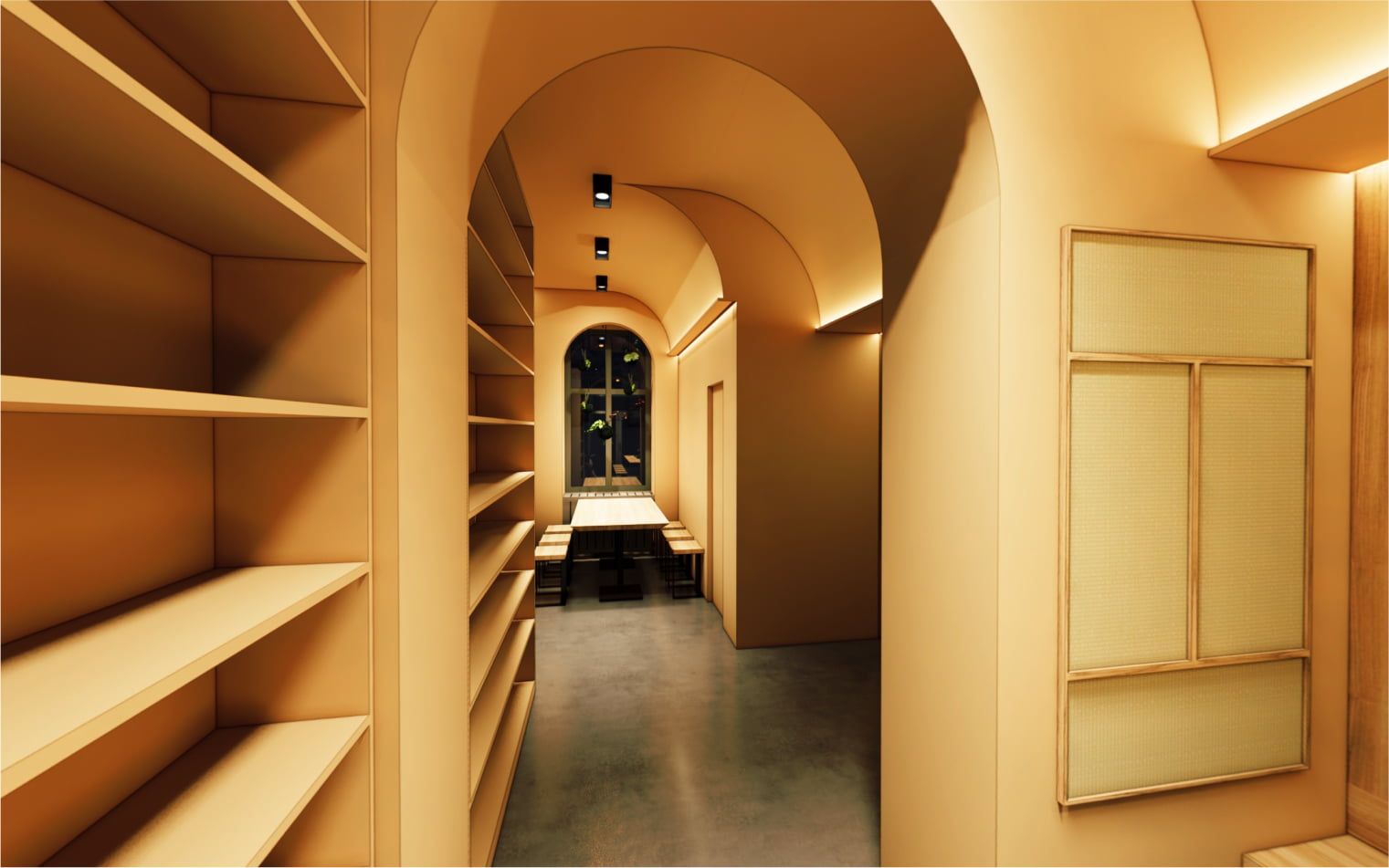 Vorschlag für einen Ryong Shop in Prenzlauer Berg: Durch die Verwendung sanfter Orangetöne und die Integration von Tatami-Wänden wurde der kompakte Raum nahtlos in eine einladende Oase verwandelt.